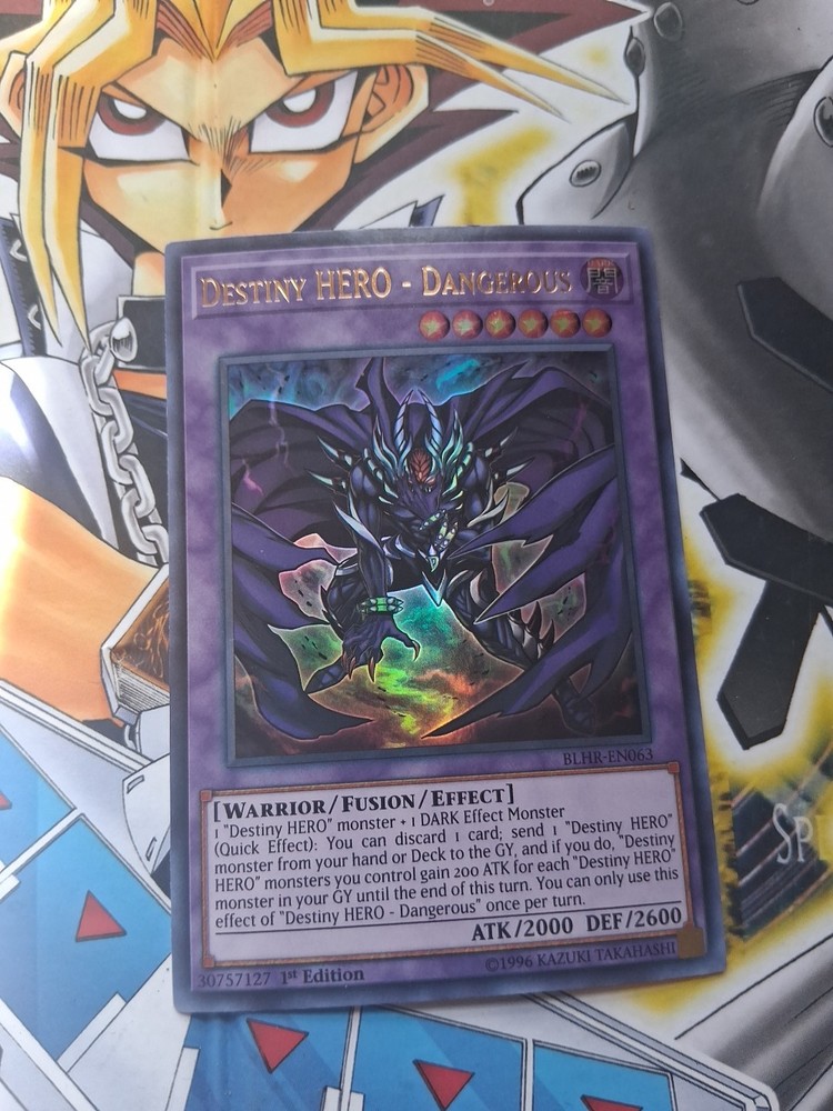 The product is a Yugioh card from the Battles of Legend: Hero's Revenge set, specifically the Destiny HERO - Dangerous card. It is classified as an Ultra Rare 1st Edition card featuring the character Danger as a Hero creature type. This collectible card is highly sought after by players and collectors of the Yu-Gi-Oh! trading card game. Its rarity and unique features make it a valuable addition to any card collection.