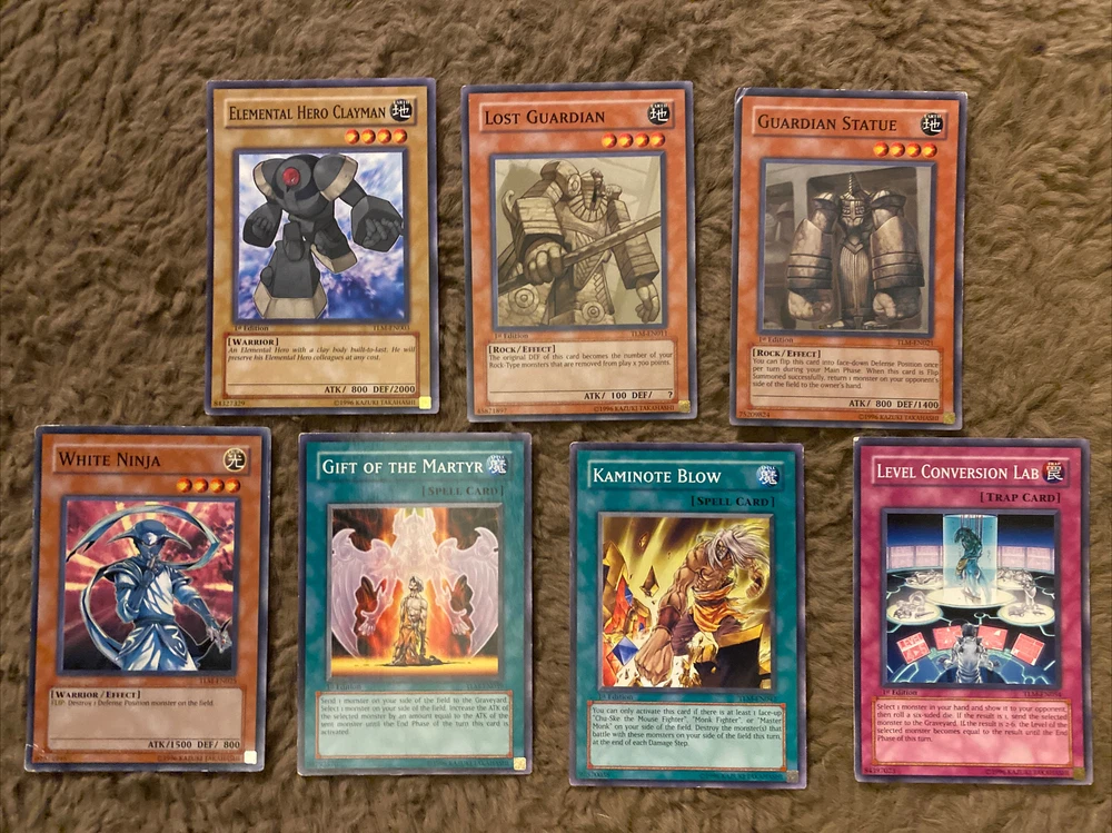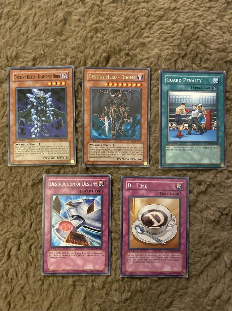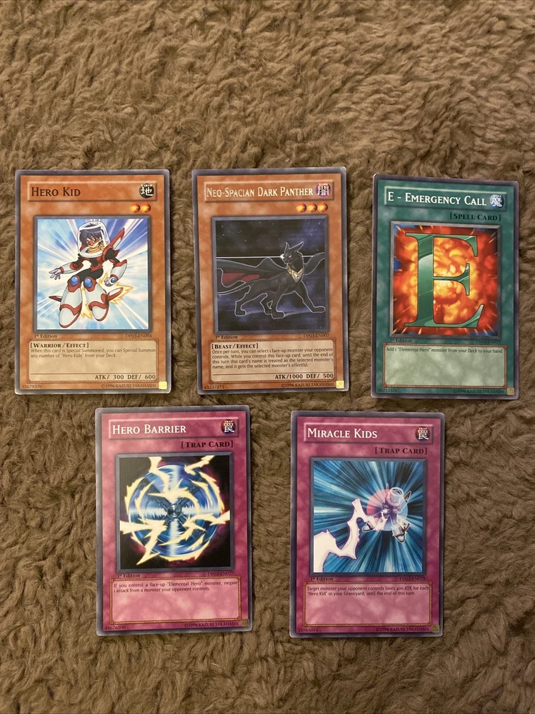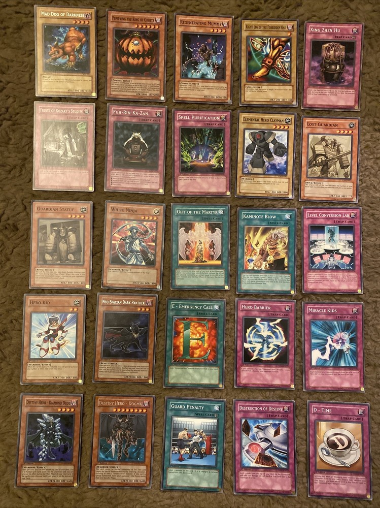 Yugioh 25 Card Lot! Includes card from IOC, MRD, DR2, DB1, RDS, TLM, DP03, and DP05. Some cards are 1st Edition. Includes 3 Silver Rares, & 22 Commons. Condition ranges from Mint, to Lightly Played. If you have any questions or need more pictures, please message me! INCLUDES: 1) Mad Dog of Darkness 1st Edition IOC-057 SILVER RARE 2) Pumpking The King of Ghosts MRD-079 3) Regenerating Mummy DR2-EN192 4) Right Leg of the Forbidden One DB1-EN135 5) Xing Zhen Hu 1st Edition RDS-EN051 6) Fruits of Kozaky’a Studies 1st Edition RDS-EN053 7) Fuh-Rin-Ka-Zan 1st Edition RDS-EN055 8) Spell Purification 1st Edition RDS-EN058 9) Elemental Hero Clayman 1st Edition TLM-EN003 10) Lost Guardian 1st Edition TLM-EN011 11) Guardian Statue 1st Edition TLM-EN021 12) White Ninja TLM-EN025 13) Gift of the Martyr 1st Edition TLM-EN039 14) Kaminote Blow 1st Edition TLM-EN042 15) Level Conversion Lab 1st Edition TLM-EN054 16) Hero Kid DP03-EN004 17) Neo-Spacian Dark Panther 1st Edition DP03-EN007 SILVER RARE 18) E - Emergency Call 1st Edition DP03-EN017 19) Hero Barrier 1st Edition DP03-EN027 20) Miracle Kids 1st Edition DP03-EN028 21) Destiny Hero - Diamond Dude 1st Edition DP05-EN003 22) Destiny Hero - Dogma 1st Edition DP05-EN007 23) Guard Penalty 1st Edition DP05-EN015 24) Destruction of Destiny 1st Edition DP05-EN023 25) D - Time 1st Edition DP05-EN025