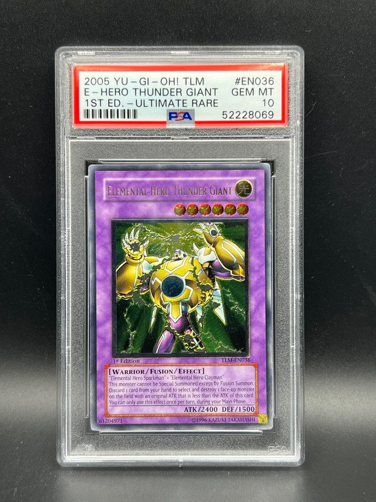 You are bidding on a Yugioh PSA 10 GEM MT Elemental Hero Thunder Giant TLM-EN036 Ultimate Rare 1st Edition from The Lost Millennium!! This card has been graded as GEM MINT - a 10 - by PSA!!! An incredible addition to any collection! Shipping is FREE on this item in the United States! You will receive the exact item pictured in the listing - for more pictures or if you have any questions, don't hesitate to contact us! All cards will be shipped in sleeves, Top Loaders (or similar), and a padded envelope or appropriately sized padded box for safe arrival. In this case, the PSA-cased card will be in a graded card sleeve as well. For orders over $250, please be advised that signature confirmation is required. Please allow 2-3 business days handling time. Make sure to check out our other listings for all of your favorite Trading Card Games! Thanks for shopping at Yeti Gaming!