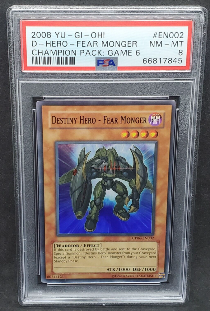 You are bidding on a Yugioh PSA 8 NM-MT Destiny Hero - Fear Monger Super Rare Card# CP06-EN002 from Champion Pack: Game 6 !!! This card has been graded as NM-MT - an 8 - by PSA!!! An excellent addition to any collection! We are a US Seller! Shipping on all items is FREE inside the United States. For international orders we use eBay's Global Shipping Program. All shipping charges, taxes, fees, etc. for international orders are calculated and collected by eBay at checkout. All PSA cards will be shipped in a padded envelope or appropriately sized padded box, with a graded card sleeve surrounding the PSA Case. For orders over $250, please be advised that signature confirmation is required. For any questions regarding shipping or otherwise, please contact us prior to purchase. Please allow 2-3 business days handling time. Make sure to check out our other listings for all of your favorite Trading Card Games! Thanks for shopping at Yeti Gaming!