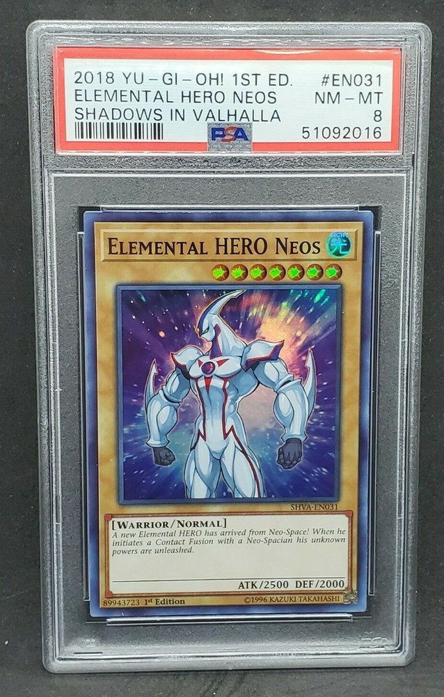 You are bidding on a Yugioh PSA 8 NM-MT Elemental Hero Neos 1st Edition Super Rare Card# SHVA-EN031 from Shadows in Valhalla !!! This card has been graded as NM-MT - an 8 - by PSA!!! An incredible addition to any collection! Shipping is FREE on this item in the United States! Do note that multiple PSA 8 graded copies of this card are available; the specific PSA Certification Number you get may vary slightly from the one in the photo. All cards will be shipped in sleeves, Top Loaders (or similar), and a padded envelope or appropriately sized padded box for safe arrival. In this case, the PSA-cased card will be in a graded card sleeve as well. For orders over $250, please be advised that signature confirmation is required. Please allow 2-3 business days handling time. Make sure to check out our other listings for all of your favorite Trading Card Games! Thanks for shopping at Yeti Gaming!