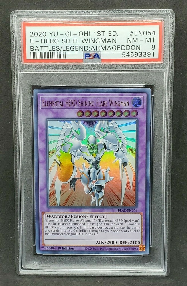 You are bidding on a Yugioh PSA 8 NM-MT Elemental Hero Shining Flare Wingman 1st Edition Ultra Rare Card# BLAR-EN054 from Battles of Legend: Armageddon !!! This card has been graded as NM-MT - an 8 - by PSA!!! An excellent addition to any collection! We are a US Seller! Shipping on all items is FREE inside the United States. For international orders we use eBay's Global Shipping Program. All shipping charges, taxes, fees, etc. for international orders are calculated and collected by eBay at checkout. All PSA cards will be shipped in a padded envelope or appropriately sized padded box, with a graded card sleeve surrounding the PSA Case. For orders over $250, please be advised that signature confirmation is required. For any questions regarding shipping or otherwise, please contact us prior to purchase. Please allow 2-3 business days handling time. Make sure to check out our other listings for all of your favorite Trading Card Games! Thanks for shopping at Yeti Gaming!