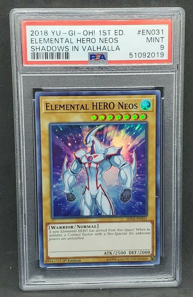 You are bidding on a Yugioh PSA 9 MINT Elemental Hero Neos 1st Edition Super Rare Card# SHVA-EN031 from Shadows in Valhalla !!! This card has been graded as MINT - a 9 - by PSA!!! An incredible addition to any collection! We are a US Seller! Shipping on all items is FREE inside the United States. For international orders we use eBay's Global Shipping Program. All shipping charges, taxes, fees, etc. for international orders are calculated and collected by eBay at checkout.! You will receive the exact item pictured in the listing - for more pictures or if you have any questions, don't hesitate to contact us! All cards will be shipped in sleeves, Top Loaders (or similar), and a padded envelope or appropriately sized padded box for safe arrival. In this case, the PSA-cased card will be in a graded card sleeve as well. For orders over $250, please be advised that signature confirmation is required. Please allow 2-3 business days handling time. Make sure to check out our other listings for all of your favorite Trading Card Games! Thanks for shopping at Yeti Gaming!