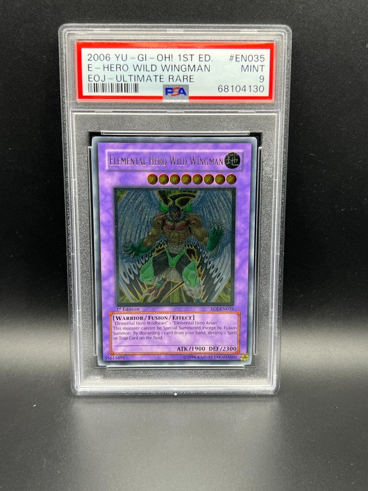 You are bidding on a Yugioh PSA 9 MINT Elemental Hero Wild Wingman EOJ-EN035 Ultimate Rare 1st Edition from Enemy of Justice!! This card has been graded as MINT - a 9 - by PSA!!! A great addition to any collection! We are a US Seller! Shipping on all items is FREE inside the United States. For international orders we use eBay's Global Shipping Program. All shipping charges, taxes, fees, etc. for international orders are calculated and collected by eBay at checkout.! All PSA cards will be shipped in a padded envelope or appropriately sized padded box, with a graded card sleeve surrounding the PSA Case. For orders over $250, please be advised that signature confirmation is required. For any questions regarding shipping or otherwise, please contact us prior to purchase. Please allow 2-3 business days handling time. Make sure to check out our other listings for all of your favorite Trading Card Games! Thanks for shopping at Yeti Gaming!