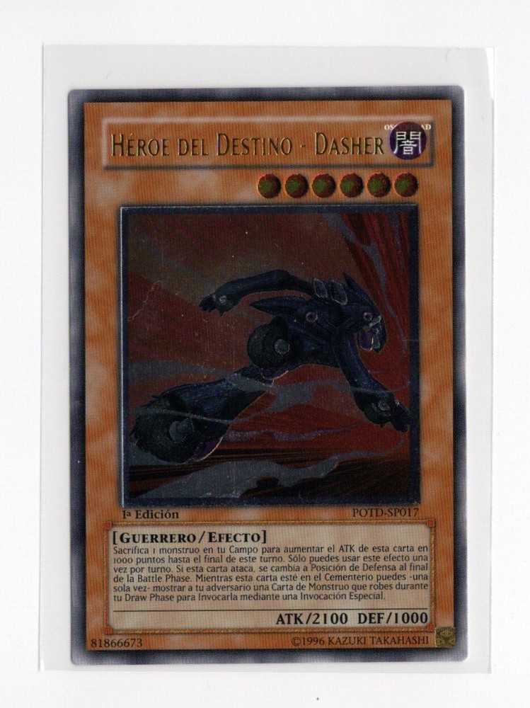 You are bidding on a Yugioh SPANISH Destiny Hero - Dasher (Heroe Del Destino - Dasher) POTD-SP017 Ultimate Rare 1st Edition Lightly Played!! This card is in Lightly Played condition. Please see the attached photos for scans of the card. Shipping is FREE on this item in the United States! All purchases above $15 will be shipped First Class, Parcel in a padded envelope. All cards will be shipped in sleeves and top loaders. Please allow 2-3 business days handling time. Make sure to check out our other listings for all of your favorite Trading Card Games! Thanks for shopping at Yeti Gaming!