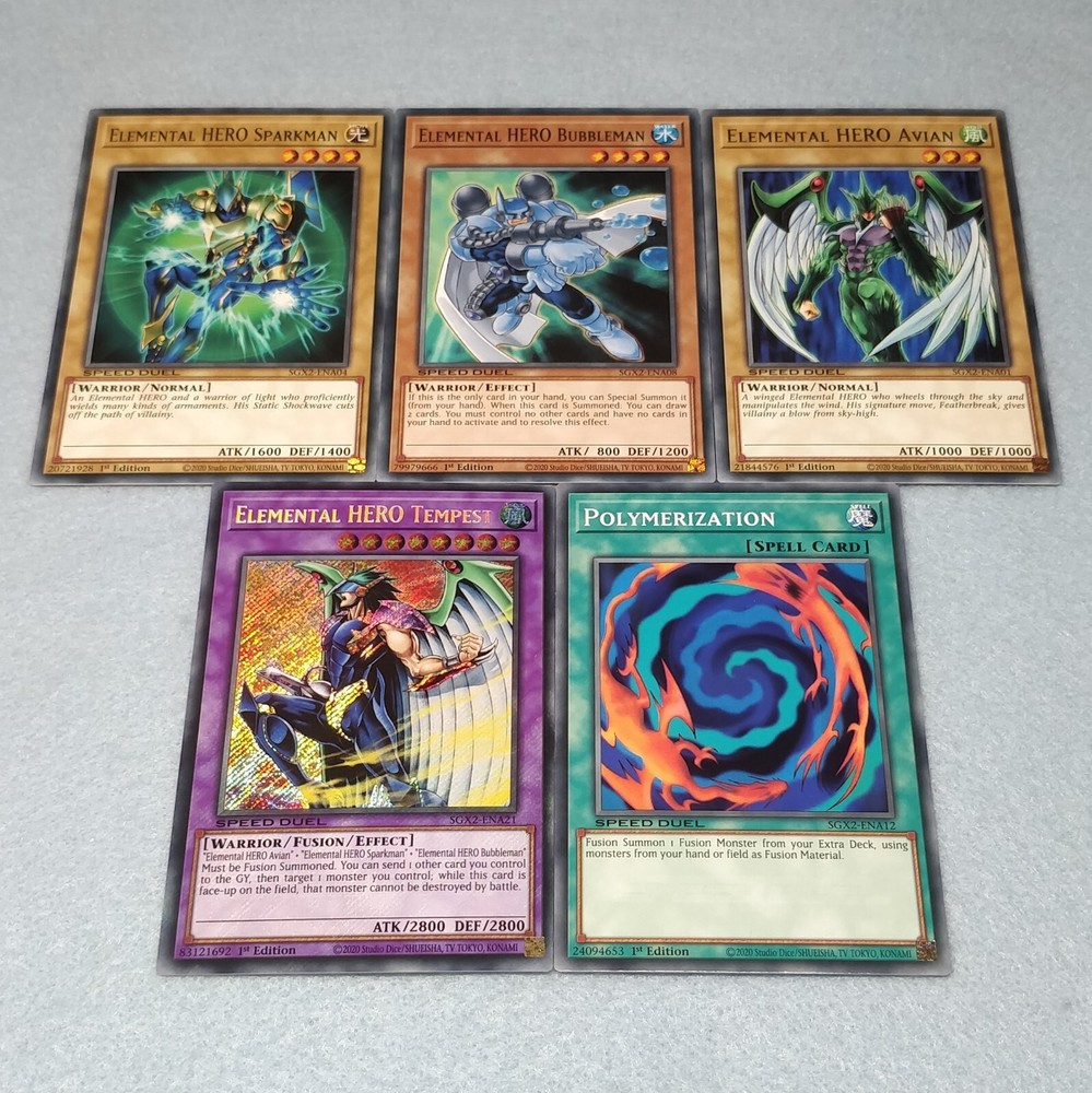 You will receive the following cards: Elemental HERO Tempest (Secret Rare) Elemental HERO Avian Elemental HERO Sparkman Elemental HERO Bubbleman Polymerization Speed Duel cards may be used in all Yu-G...