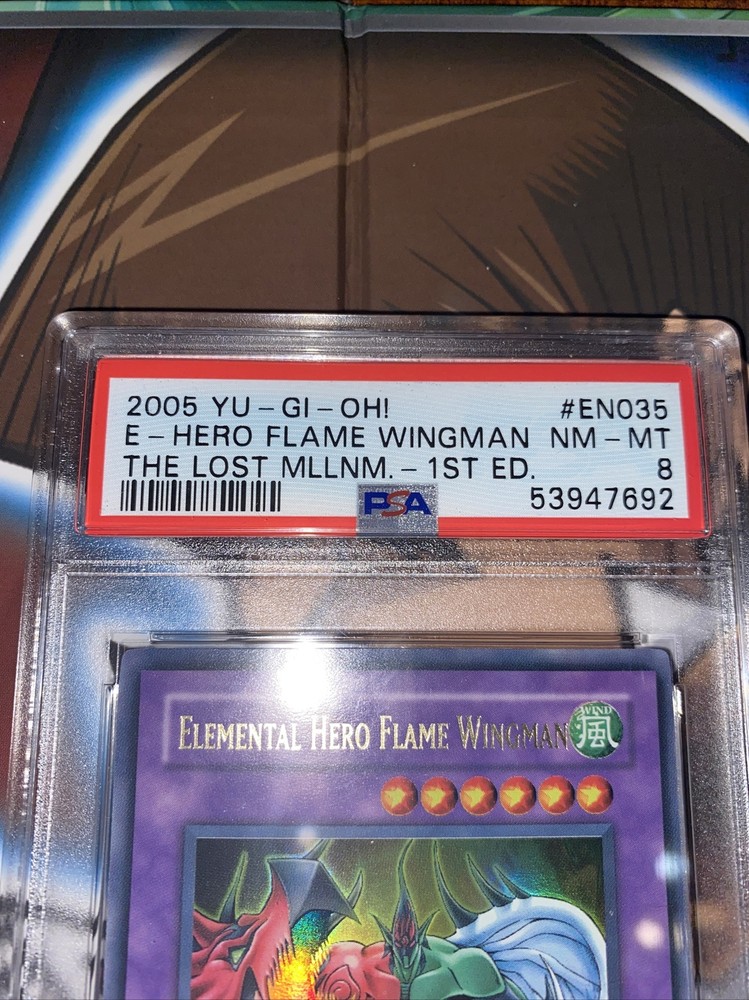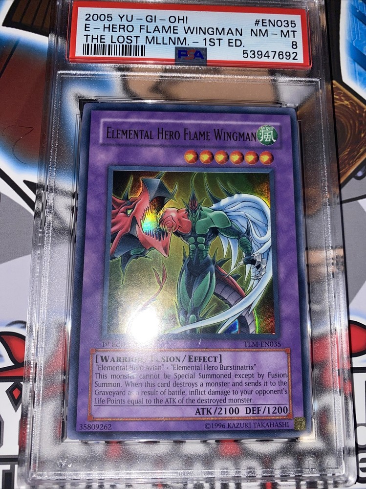 Yugioh - The Lost Millenium - Elemental Hero Flame Wingman - 1st Edition - PSA 8. Condition is "New". Shipped with USPS First Class. Please see pictures for condition. Don’t hesitate to reach out if you have any questions or concerns. No lowball offers please. All my cards are 1000% authentic. See my other items for more amazing Pokemon and Yugioh cards!