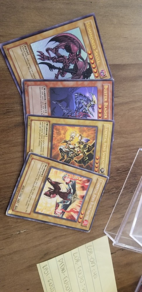 Elemental Hero Burstinatrix MDP2-EN003 (Moderate play) Elemental Hero Sparkman YSD-ENS01 Buster Blader YAP1-EN006 Summoned Skull YAP1-EN003 Other than Burstinatrix, the rest are all light play. Open to offers on individual cards.