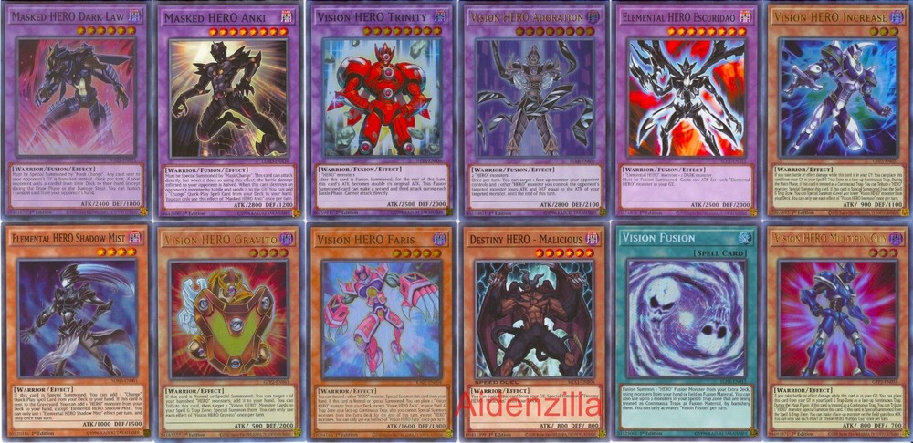 Selling a fantastic Yugioh Vision HERO Deck . Bonus: 1 Pack of Ultra Pro 60 Count Sleeves (color chosen at random) 1 Official Yugioh Token Card (card chosen at random) 1 Official Yugioh Field Center (card chosen at random) 15x Extra Deck: 2x Vision HERO Adoration (ultra rare) 2x Vision HERO Trinity (super rare) 1x Elemental HERO Sunrise 1x Elemental HERO Escuridao 1x Masked HERO Dark Law (super rare) 1x Masked HERO Anki 1x Elemental HERO Great Tornado 1x Starving Venom Fusion Dragon 1x Xtra HERO Cross Crusader 1x Xtra HERO Wonder Driver (silver ultra rare) 1x Xtra HERO Dead Decimator 1x Knightmare Phoenix (ultra rare) 1x Knightmare Unicorn (super rare) 19x Monsters: 3x Vison HERO Faris (super rare) 3x Destiny HERO Malicious 2x Vision HERO Vion (ultra rare) 2x Vision HERO Gravito (ultra rare) 2x Vision HERO Increase (ultra rare) 2x Vision HERO Poisoner (ultra rare) 1x Vision HERO Multiply Guy (ultra rare) 1x Vision HERO Minimum Ray (ultra rare) 1x Vision HERO Witch Raider (secret rare) 1x Elemental HERO Stratos (silver ultra rare) 1x Elemental HERO Shadow Mist (super rare) 17x Spells: 3x Vision Fusion (2 secret rare, 1 common) 3x Magic Planter (rare) 3x Materialization 2x Polymerization 2x Mask Change 1x Vision Release (ultra rare) 2x A HERO Lives (ultra rare) 1x Reinforcement of the Army (rare) 4x Traps: 3x Solemn Strike 1x Apparition (ultra rare) Check out my other items ! All cards are authentic! 1st/unlimited edition may vary from the picture. US Buyers Shipping is through USPS. International Buyers Shipping cost depends on destination and weight. I will not falsify value of item on custom forms. Import duties, taxes, and charges are not included in the item price or shipping cost. These charges are the buyer's responsibility. Please check with your country's customs office to determine what these additional costs will be prior to bidding or buying.