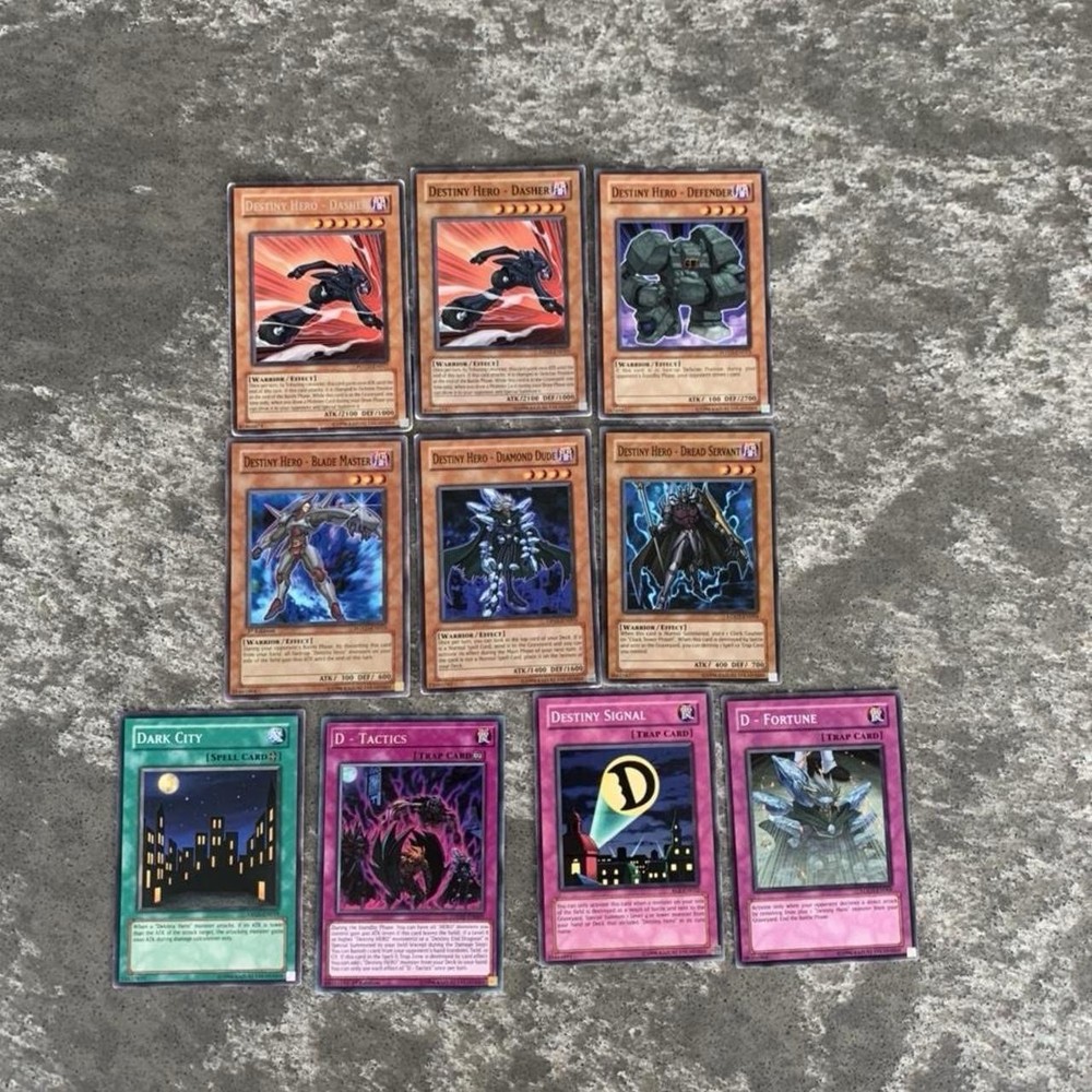 YU-GI-OH! Yugioh 10 Card Destiny Hero Bundle NEAR MINT unless specified, open to offers 1x Destiny Hero - Dasher (Rare) Used 1x Destiny Hero - Dasher (Common) Used/Near Mint 1x Destiny Hero - Defender (Common) 1x Destiny Hero - Blade Master (Common) 1x Destiny Hero - Diamond Dude (Common) Used/Near Mint 1x Destiny Hero - Dread Servant (Common) 1x Dark City (Common) 1x D - Tactics (Rare) 1x Destiny Signal (Common) 1x D - Fortune (Common)
