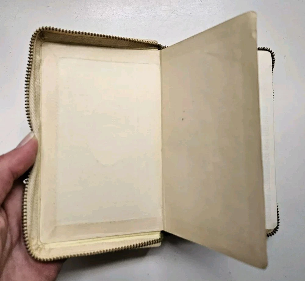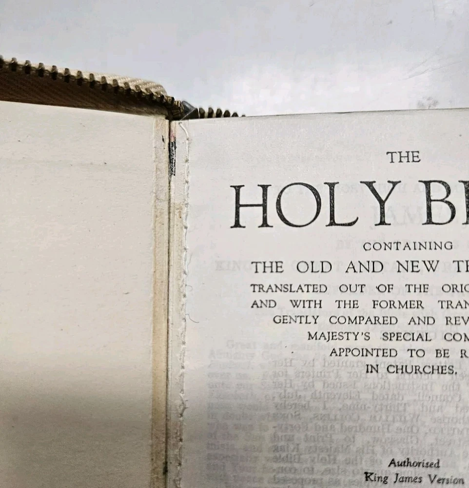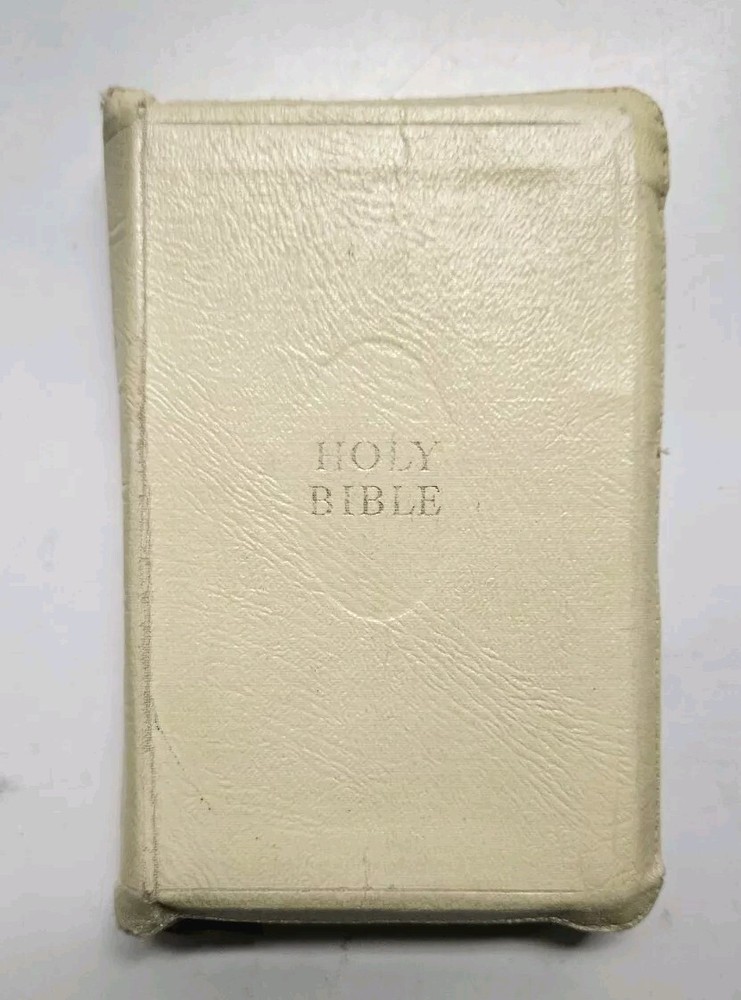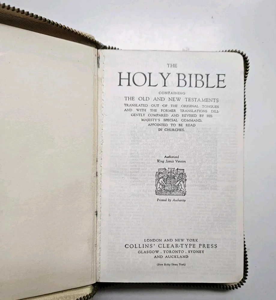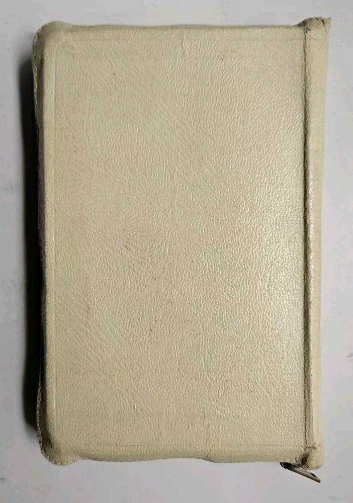 Vintage Collins KJV Bible - Collins Clear-Type Press - White Genuine Leather. New Ruby text. 1950. King James Version. Printed in Great Britain. Old and New Testament. Condition: Fair/Acceptable. Zipper works well. Cover with some minor/intermediate but age appropriate wear. First leaf a bit separated from title page, not a big issue. Gilded page edges are bright, except for a strip in the center on the top edge, probably due to faintly running the zipper on them. Binding secure. No writing or marks or inscription. Measures 4x6x1 inches. Lovingly packed and shipped via USPS Media Mail. Make offers on multiple books to get a great discount!