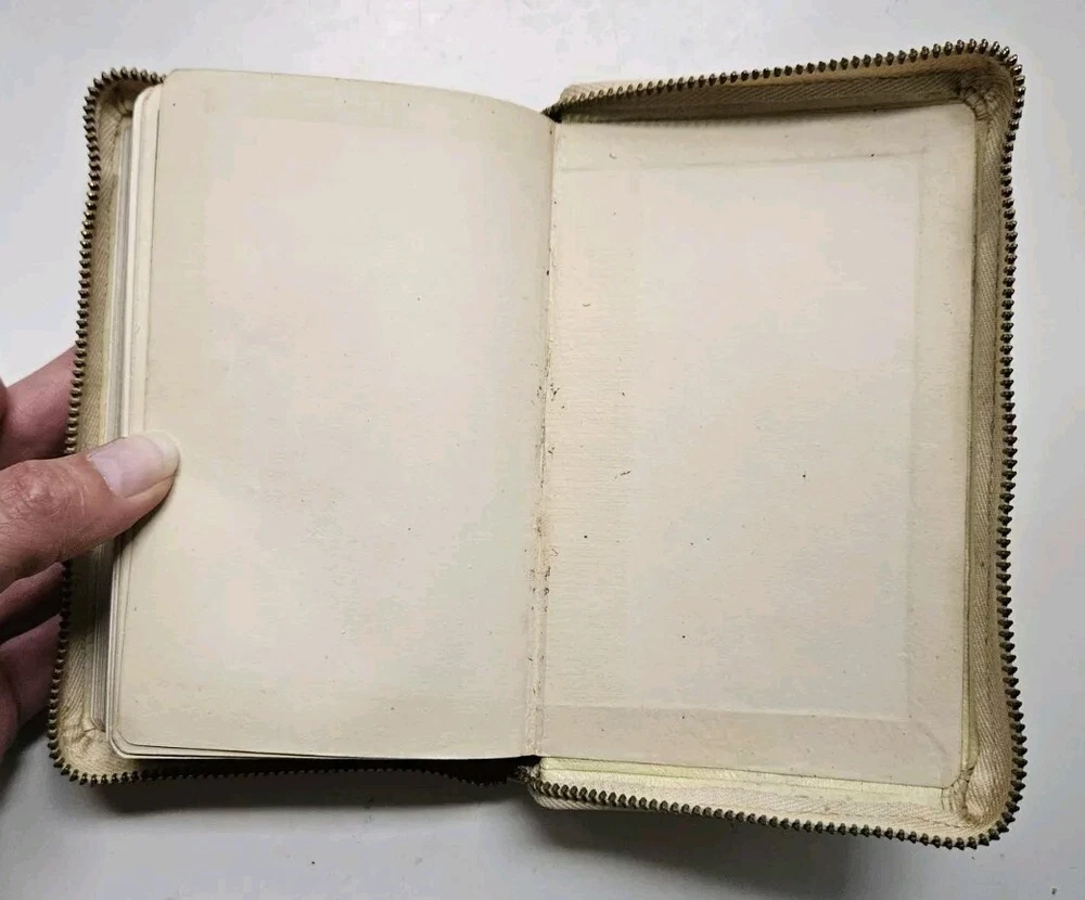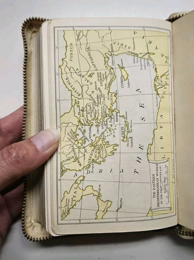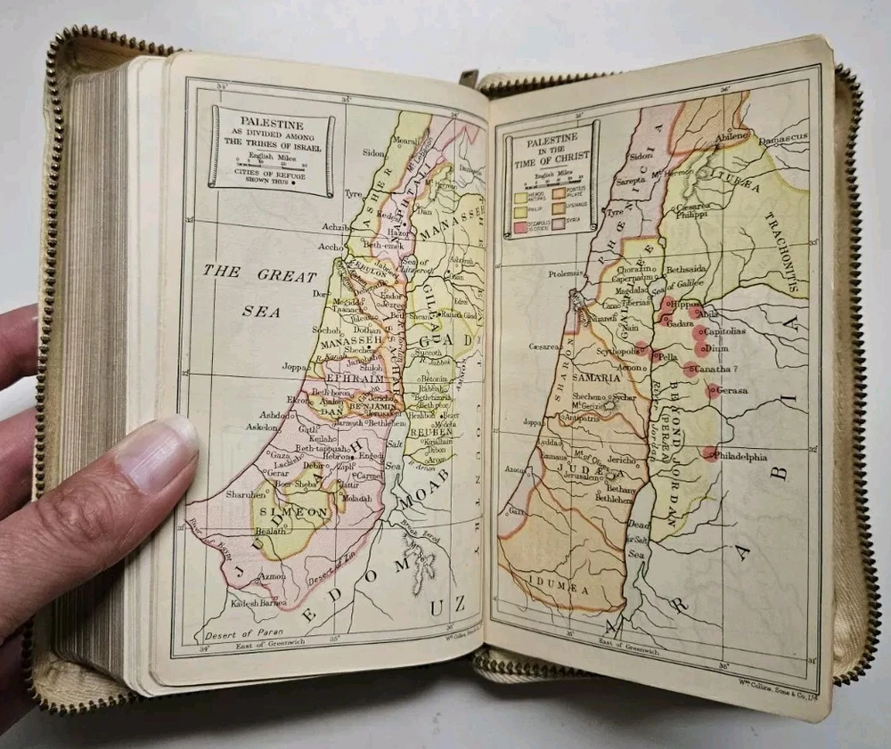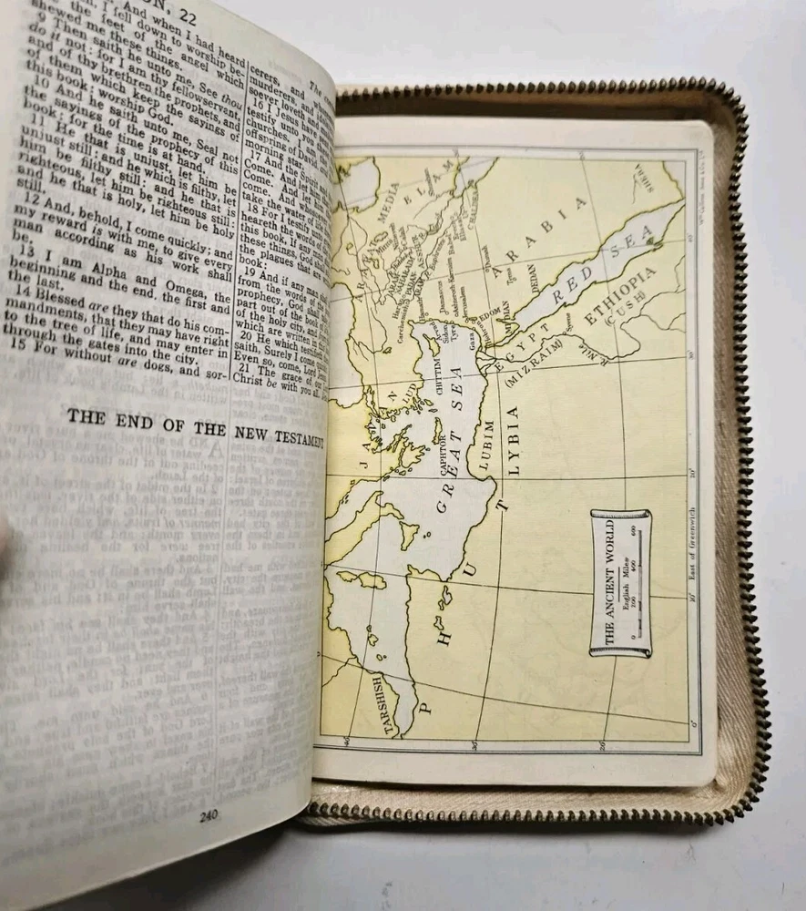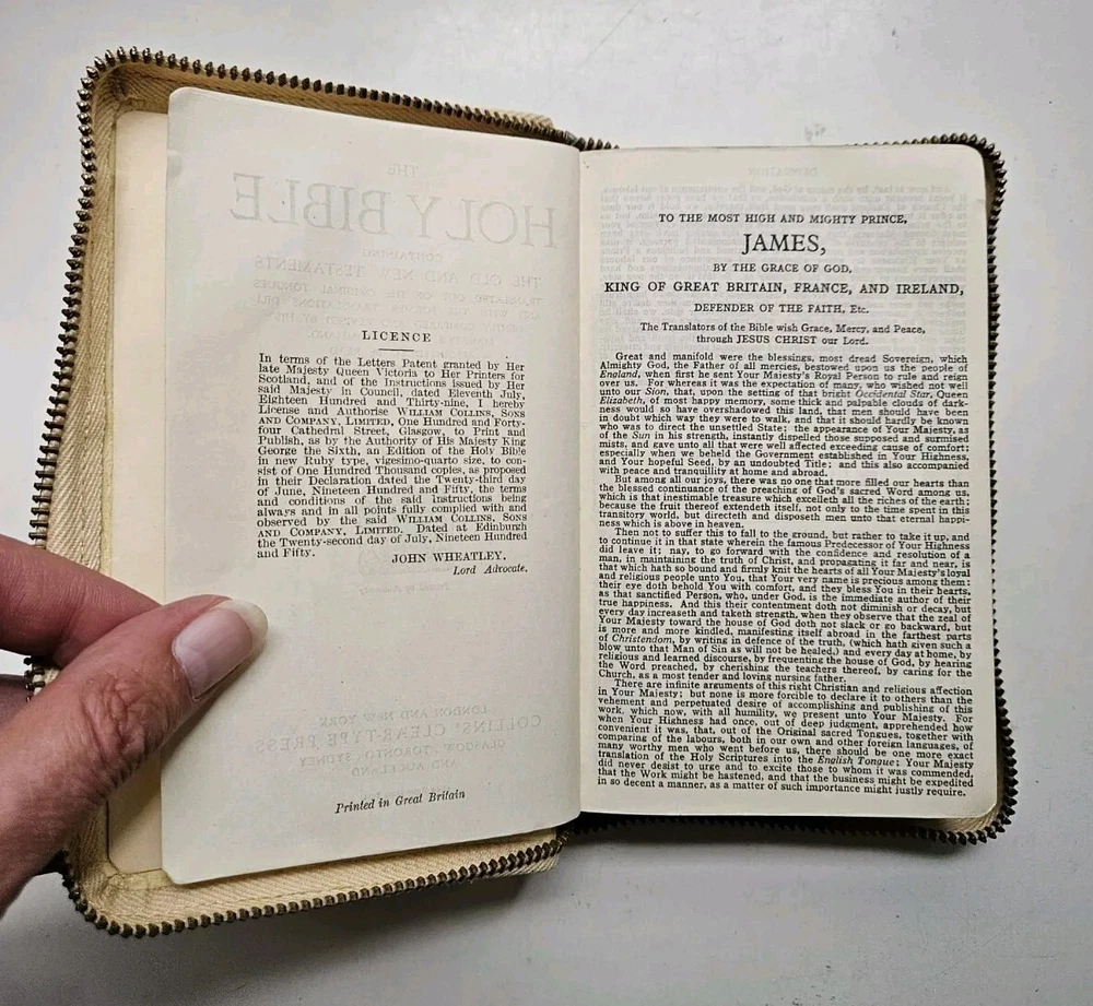 Vintage Collins KJV Bible - Collins Clear-Type Press - White Genuine Leather. New Ruby text. 1950. King James Version. Printed in Great Britain. Old and New Testament. Condition: Fair/Acceptable. Zipper works well. Cover with some minor/intermediate but age appropriate wear. First leaf a bit separated from title page, not a big issue. Gilded page edges are bright, except for a strip in the center on the top edge, probably due to faintly running the zipper on them. Binding secure. No writing or marks or inscription. Measures 4x6x1 inches. Lovingly packed and shipped via USPS Media Mail. Make offers on multiple books to get a great discount!