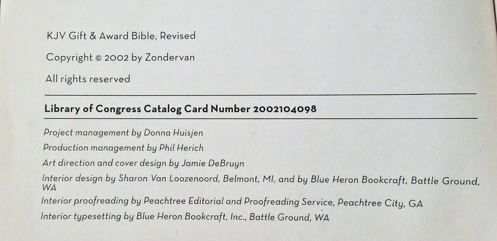 A beautiful gift and award edition of the King James Version of the Holy Bible. Features: Regular, easy-to-read type Imitation Leather Softcover Publisher: Zondervan Year of publication: 2002 Number of pages: 820 Approximate dimensions: 8-1/4" x 5-1/2" x 1-1/2" Weight: 1lb 7oz Contents include: Presentation page Old and New Testaments Overview of the Bible Life in New Testament Times Teachings, Ministry, Miracles, and Parables of Jesus Famous Stories and People of the Bible Dictionary Color maps of The Holy Land Gold-edged pages Words of Christ in red lettering Like New condition with no blemishes or marking of pages. (See photos.) Add this Bible to your religious library - or make it a special gift for someone you care about. Ships same day payment is received, if possible - next day for sure. Ten-percent of the proceeds go to St. Jude's Children's Research Hospital. And don't wait! Purchase right now - before someone else beats you to the punch.