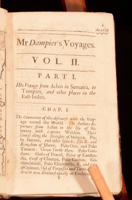 Click here to see our other books! Voyages and Descriptions Vol II William Dampier c1700 James Knapton : London 8" by 4.5" 184, 132, 112pp SUMMARY A scarce copy of this work by William Dampier, in a leather binding. Folding Maps,Leather Binding,Scarce Overall Condition: Good This book weighs 0.5 KG when packed UK Postage: £ 3.99 US Postage: £ 15.99 EU Postage : £ 13.99 European Postage: £ 14.99 Asia Postage: £ 18.99 Worldwide Postage: £ 19.99 DESCRIPTION Lacking title page but pagination suggests this is the 1700 second edition. Complete with four folding maps. William Dampier was the first Englishman to explore parts of what is today Australia, and the first person to circumnavigate the world three times. He was one of the most important British explorers of the period between Sir Walter Raleigh and James Cook. CONDITION In a full calf binding. Externally, rubbed with some bumping. Joints starting. Hinges tender. Ink signature to front pastedown. Lacking title page. Internally, firmly bound. Pages bright with cockling and occasional spots. Overall Condition: Good GLOSSARY OF TERMS Overall Condition (Dustwrapper condition rating is shown after that for the book itself, where a dustwrapper is present) Fine - Very well preserved copy showing very little wear Very Good Indeed - Only one or two minor faults, really a very attractive copy Very Good - Quite a wide term meaning no major faults but probably several smaller ones often expected given the age of the book, but still a respectable copy Good - Meaning not very good. Some more serious faults as will be described in the condition report under 'condition' Good Only - Meaning one or more faults that could really do with repair Fair - As with good only above but with other faults leaving a compromised copy even after repair Poor - Really bad and possibly seriously incomplete. We only sell books in this condition where their rarity or value makes them attractive none the less. Major defects will be described. GUARANTEE We offer a full money back guarantee on our descriptions. Please ask for details and conditions. We prefer PAYPAL. If you pay via PAYPAL we will post the item off the same or the next working day with the postage you have selected. Please note we cannot accept USD cheques