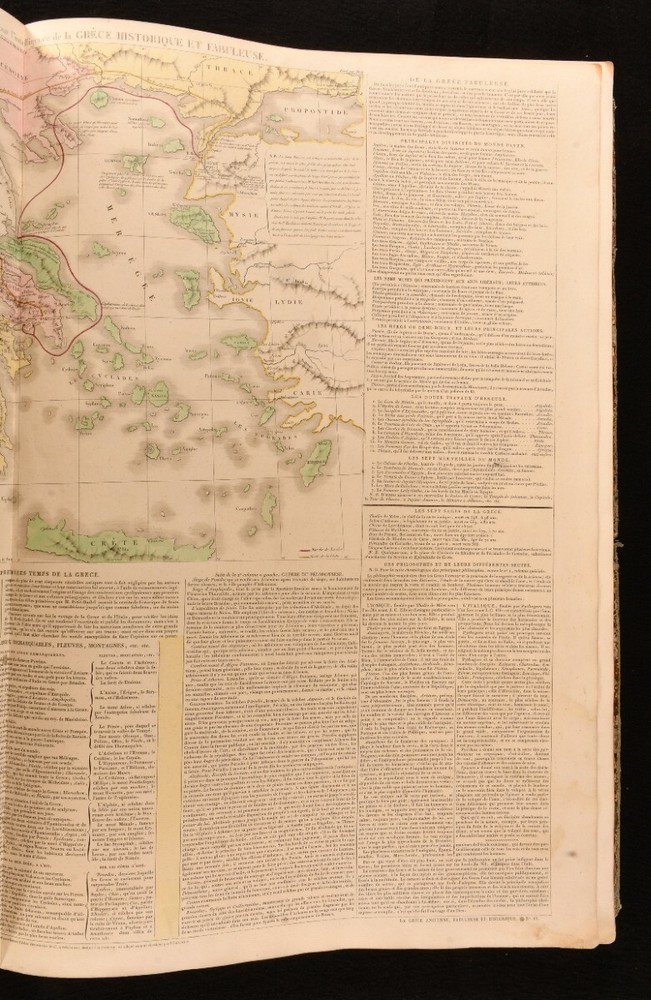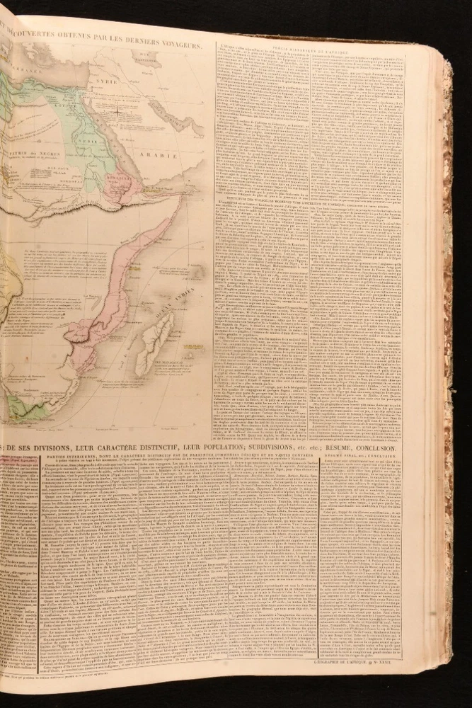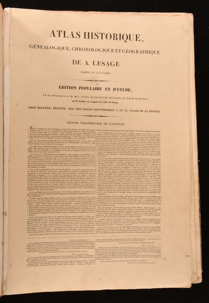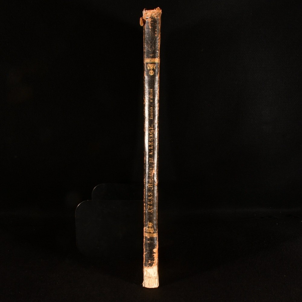 Click here to see our other books! Atlas Historique, Généalogique, Chronologique Et Géographique A. Lesage c1835 Delloye : Paris 21" by 14" 70pp SUMMARY Contemporary maps of European nations, and historical maps are accompanied by genealogical tables and precise descriptions in this coloured volume. Illustrated,Leather Binding,Publishers' Original Binding Overall Condition: Good This book weighs 4 KG when packed UK Postage: £ 4.49 US Postage: £ 39.99 EU Postage : £ 26.99 European Postage: £ 36.99 Asia Postage: £ 65.99 Worldwide Postage: £ 99.99 DESCRIPTION Comprised of thirty five double sheets, often in colour, this French atlas offers contemporary and historical maps, alongside genealogical tables and precise descriptions, collated and complete. With contemporary maps of European nations such as Holland, Switzerland, and Russia, continental maps, a map of the Roman Empire, as well as Ancient Greece and the Ancient World. CONDITION In the publisher's original quarter leather binding over hard boards. Externally, a little worn. Rubbed to the boards, joints and the spine. The calf is a little rubbed at the joints, and the spine is missing two inches of calf to the tail, and has several closed tears to the head. Lightly bumped with some moderate wear to the extremities. Internally, firmly bound. Aside from some handling marks to the endpapers, pages are a little age-toned but clean throughout. Overall Condition: Good GLOSSARY OF TERMS Overall Condition (Dustwrapper condition rating is shown after that for the book itself, where a dustwrapper is present) Fine - Very well preserved copy showing very little wear Very Good Indeed - Only one or two minor faults, really a very attractive copy Very Good - Quite a wide term meaning no major faults but probably several smaller ones often expected given the age of the book, but still a respectable copy Good - Meaning not very good. Some more serious faults as will be described in the condition report under 'condition' Good Only - Meaning one or more faults that could really do with repair Fair - As with good only above but with other faults leaving a compromised copy even after repair Poor - Really bad and possibly seriously incomplete. We only sell books in this condition where their rarity or value makes them attractive none the less. Major defects will be described. GUARANTEE We offer a full money back guarantee on our descriptions. Please ask for details and conditions. We prefer PAYPAL. If you pay via PAYPAL we will post the item off the same or the next working day with the postage you have selected. Please note we cannot accept USD cheques
