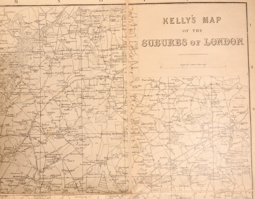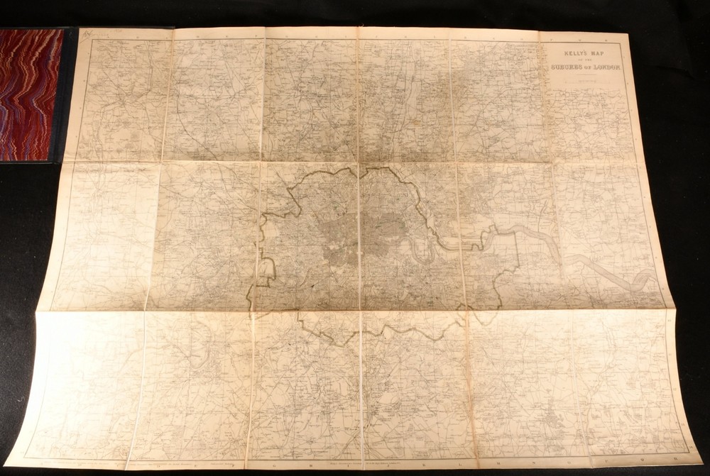Click here to see our other books! Kelly's Map of the Suburbs of London Anonymous c1900 Kelly's Directories Limited : London 10" by 7" Unpaginated SUMMARY A superior copy of this Victorian map detailing London and its surroundings. Leather Binding,Scarce Overall Condition: Very Good Indeed This book weighs 0.5 KG when packed UK Postage: £ 3.99 US Postage: £ 15.99 EU Postage : £ 13.99 European Postage: £ 14.99 Asia Postage: £ 18.99 Worldwide Postage: £ 19.99 DESCRIPTION Kelly's Directories Ltd. was established to function as a trade directory registering local trade owners. It remains an important record for historians and researchers. The map details London and its surrounding suburbs, and measures 37.5x28in. Undated: the company name Kelly & Co. was renamed Kelly's Directories Limited in 1897, as seen with this map. A prior owner has incorrectly dated it c1870. CONDITION In a full cloth binding. Externally very smart, some scratches to the boards, wear to the head and tail of the spine and label is rubbed away. Internally firmly bound, map has two prior owner's inscription, an incorrect circa date and a few green pencil marks to the map, otherwise bright and clean. Overall Condition: Very Good Indeed GLOSSARY OF TERMS Overall Condition (Dustwrapper condition rating is shown after that for the book itself, where a dustwrapper is present) Fine - Very well preserved copy showing very little wear Very Good Indeed - Only one or two minor faults, really a very attractive copy Very Good - Quite a wide term meaning no major faults but probably several smaller ones often expected given the age of the book, but still a respectable copy Good - Meaning not very good. Some more serious faults as will be described in the condition report under 'condition' Good Only - Meaning one or more faults that could really do with repair Fair - As with good only above but with other faults leaving a compromised copy even after repair Poor - Really bad and possibly seriously incomplete. We only sell books in this condition where their rarity or value makes them attractive none the less. Major defects will be described. GUARANTEE We offer a full money back guarantee on our descriptions. Please ask for details and conditions. We prefer PAYPAL. If you pay via PAYPAL we will post the item off the same or the next working day with the postage you have selected. Please note we cannot accept USD cheques