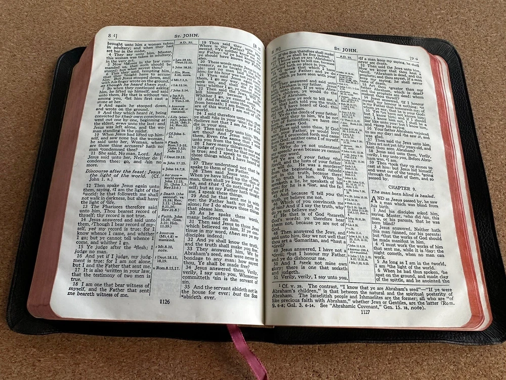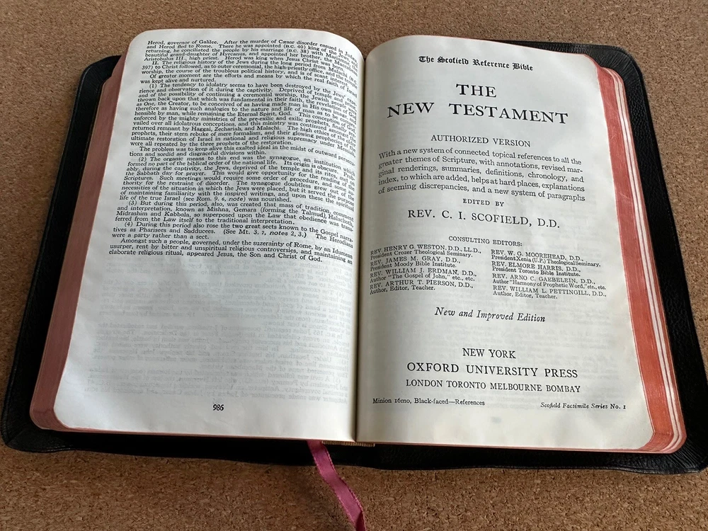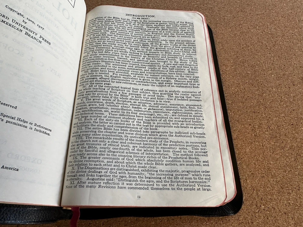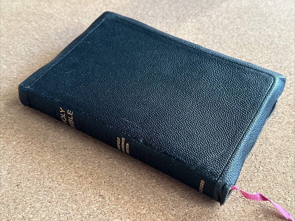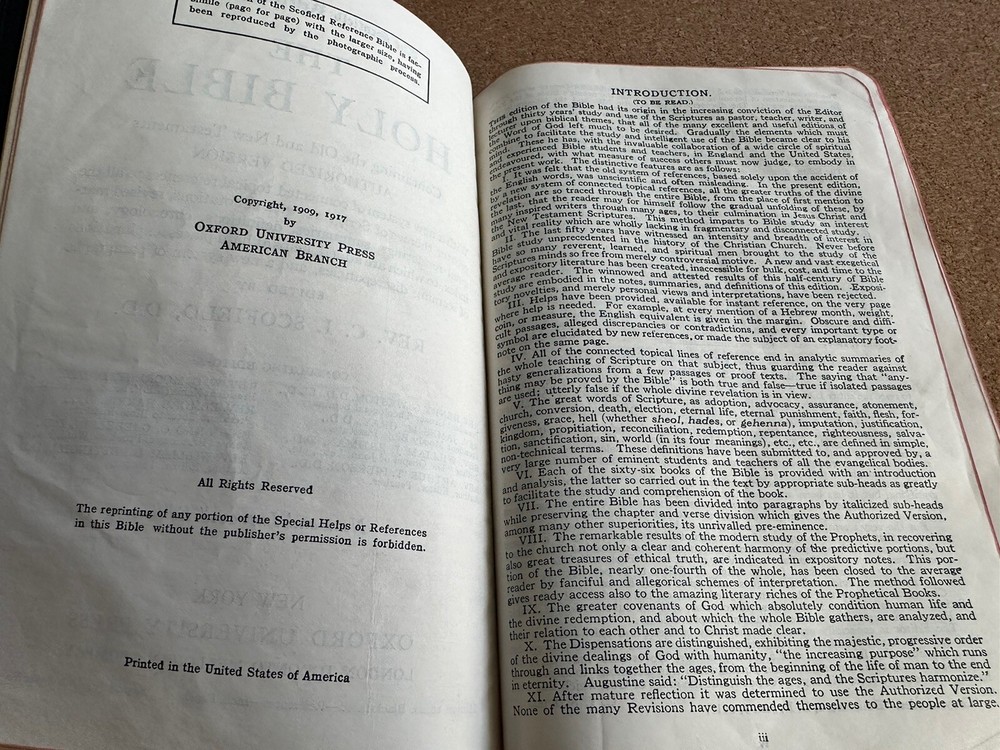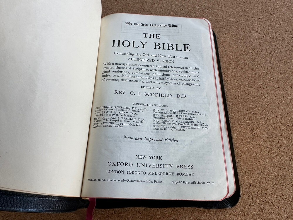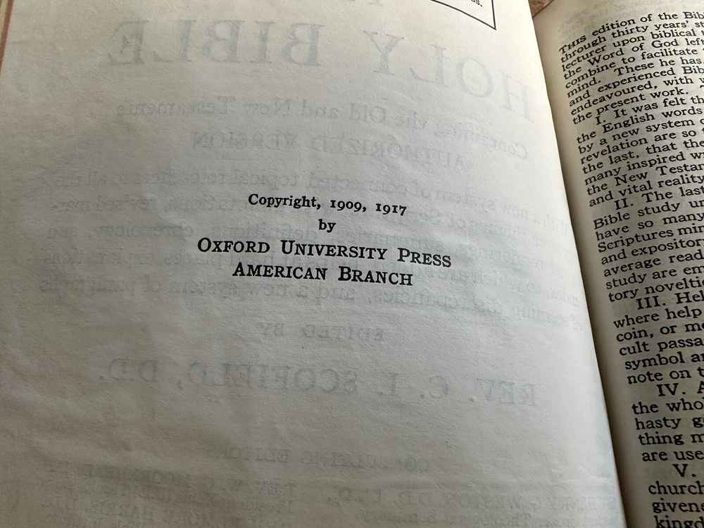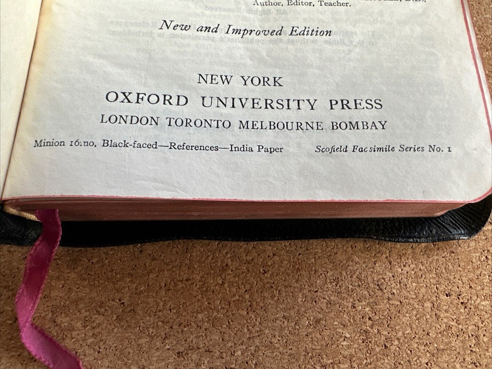 I have available a 1917 edition of the Scofield Reference Edition Bible published by Oxford. I can tell the cover is in fact leather but it is not stated inside the cover of the Bible. This does have maps at the end as is marked T II 42 33X at the lower edge of one of the end papers. This would have been the first revised edition after the original edition was published in 1909. The leather cover has rubbed edges / corners with a few very small rips in the leather along the upper / lower edges of the spine. Pages are all in very good condition with no rips, writing or highlighting. There is just some very faint wrinkling on some pages (nothing major). When the Bible is closed there are some scratches along the outer gold edging, but a bulk of the gold is still intact on the outer page edges (sorry my photos don’t show that too well). The only thing to really note is the black paste down inside the back cover is lifting just a little along the outer edge, see last photo. Overall, the Bible is in very good condition. I believe this is the King James Version of the Bible, but it does not state on the title page. The Bible does have a light musty smell when held very close from being stored away, not a smoke smell. Bible cover measures roughly 7 3/4 inches long, 5 1/4 inches wide, by 1 inch in depth. I will mail the Bible insured with signature due upon delivery due to the value. Please feel free to ask any questions. I only ship within the U.S. Thank you for viewing my auction.