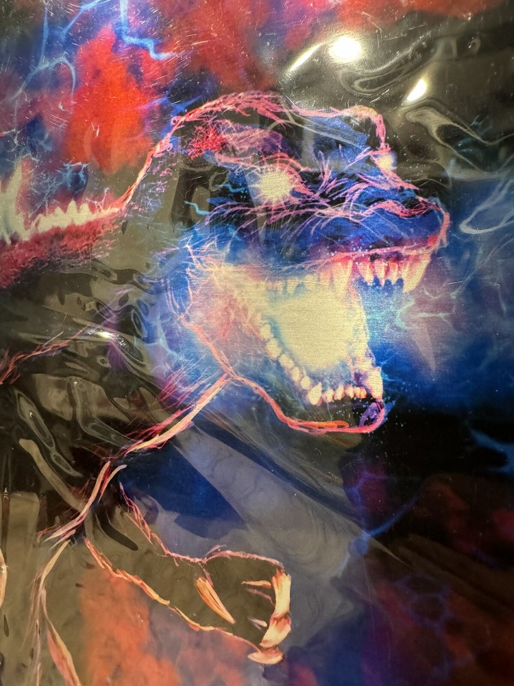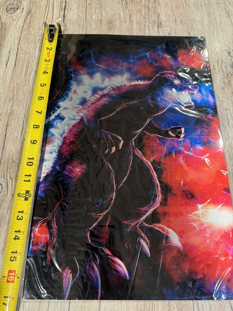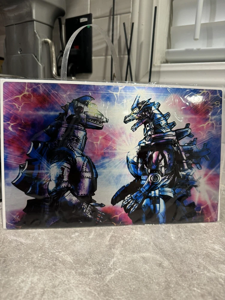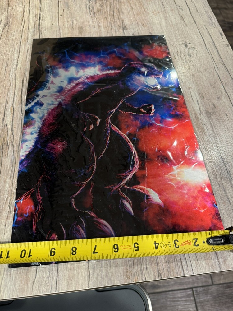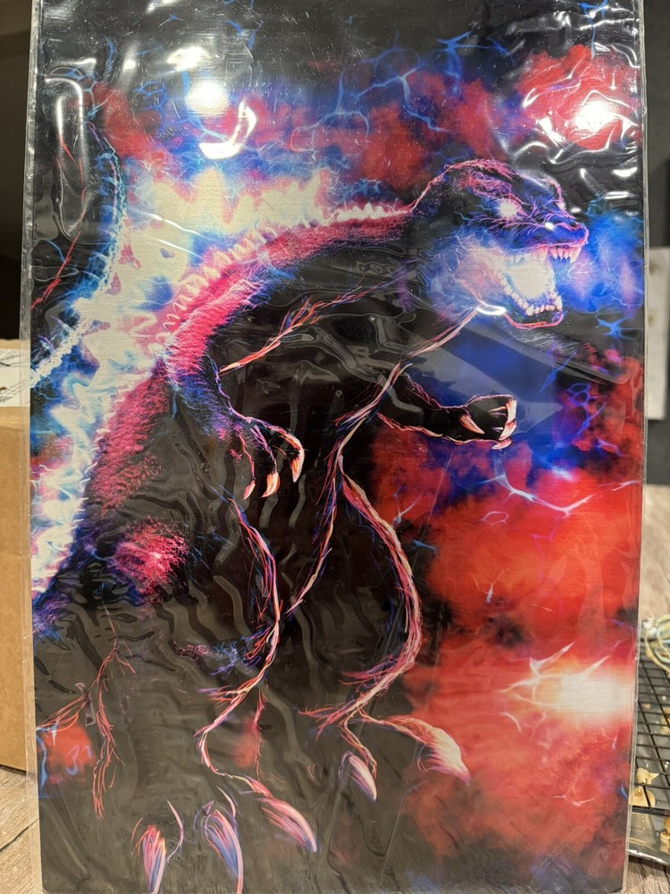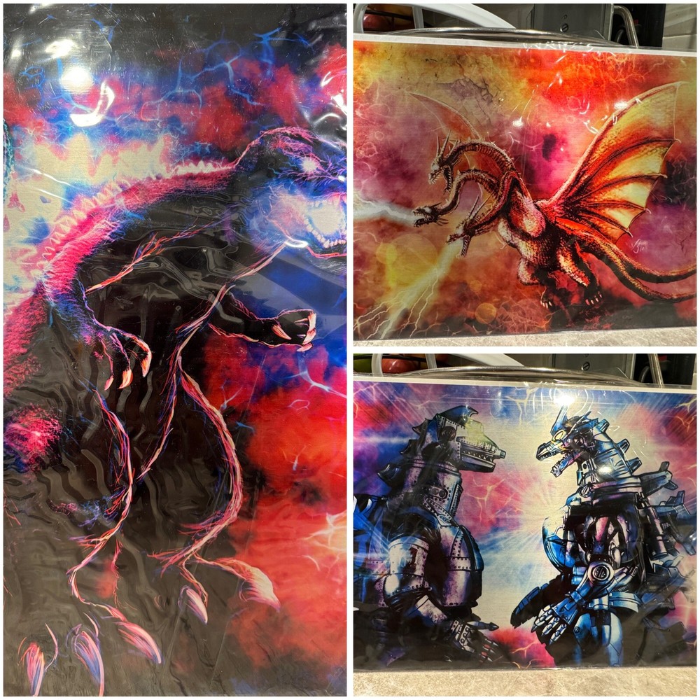 Beautiful metal art by Jerry pesce Godzilla, MechaGodzilla and kingidorah all for $150 17” x 11” Godzilla The other 2 are about 10 1/2” x 7”