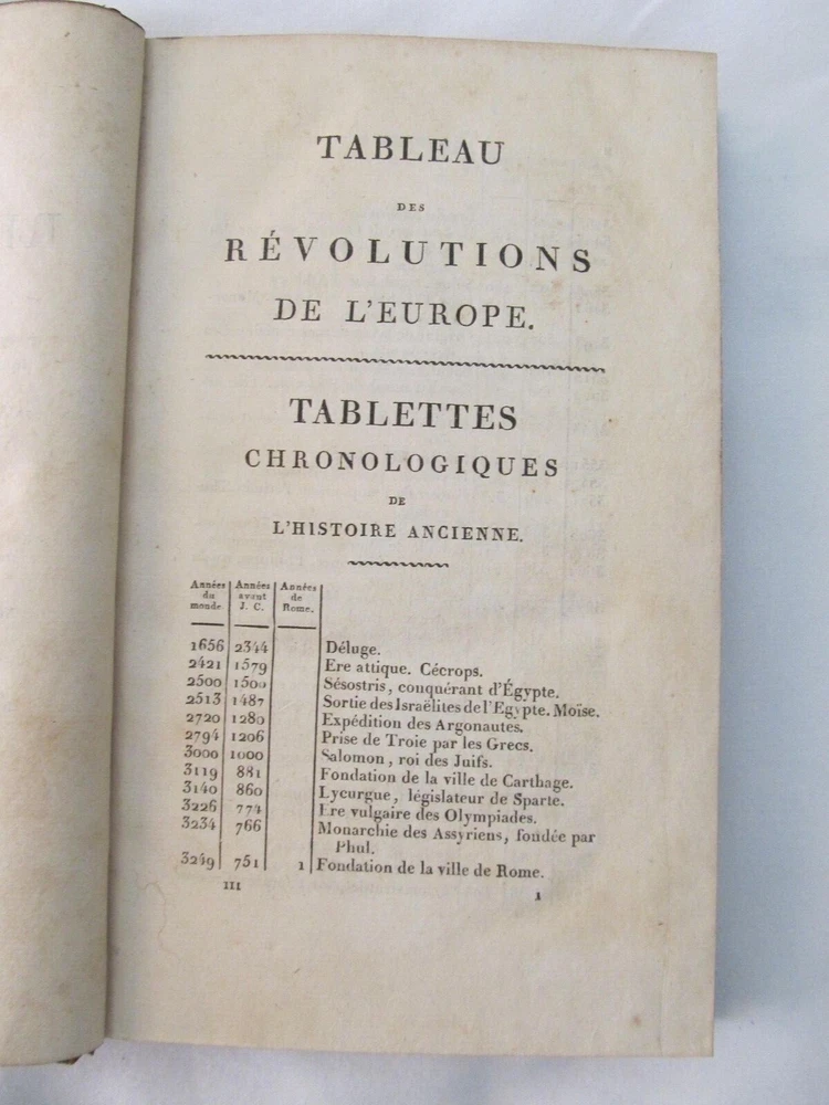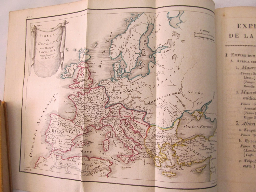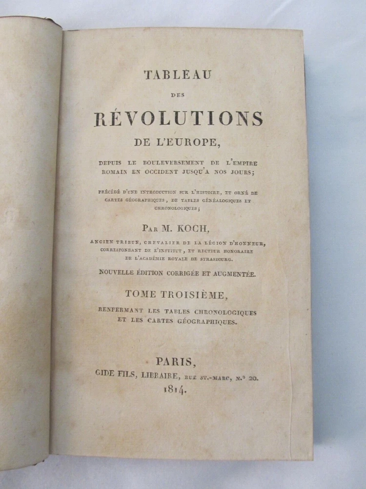 “Tableau des Revolutions de Europe, Depuis le Bouleversement, de l'Empire Romain en Occident Jusqu'a nos Jours" (Volume 3 of 4 only) by M. Koch. Published by Gide Fils, Paris (1814). The title of this vintage book translates as "Chart of the Revolutions of Europe, Since the Upheaval, of the Roman Empire in the West Until The Present". This book is over two hundred years old and in terrific, clean condition. The maps fold out and the original color is unfaded.