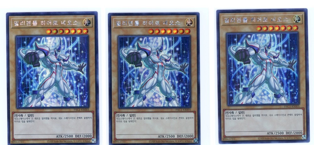 x3 Elemental HERO Neos Alternate Art Secret Rare - PAC1-KR005 - Korean YuGiOh Prismatic Art Lot contains three separate copies of the card. The card was personally pulled pack fresh and was immediately put into a sleeve and top loader. For shipping: cards will be placed in a Card Saver 1 or toploader, placed between two pieces of cardboard, put into a team bag, then inserted into a bubble mailer. I will tape all of the edges of the bubble mailer to prevent ripping and water damage. I use USPS First Class Shipping with a tracking number that will be provided to you through eBay.