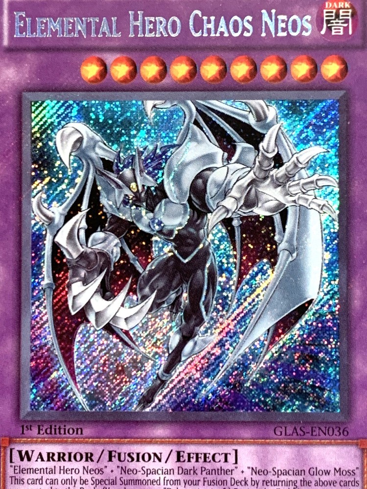 This auction is for (1x) one of the card listed in the title, in the condition listed in the title Elemental Hero Chaos Neos GLAS-EN036 Secret Rare 1st Edition near mint If the condition is not specified the items will be in mint/near mint condition See our grading scale for details. FOR TRADING CARDS: CONDITION INFORMATION v Near Mint (NM) – Card will be Mint or very close to it. v Lightly Played (LP) – Card will have edge wear and/or small dents, but no major creases. v Moderately Played/Played (MP/P) – Card will have visible creases, dents and/or edge wear. v Heavily Played (HP) – Card will noticeable damage such as large creases and/or heavy edge wear. v Damaged (Da) - Card will be in very played condition, heavy edgewear, large creases, entire card may be played. SHIPPING INFORMATION Ø Your items will be shipped out within 24 hours of purchase on BUSINESS DAYS ONLY . This excludes Saturdays, Sundays, and US Holidays. Please allow 2-9 business days for USPS to deliver your items Ø Please add all items to your cart prior to checkout to ensure your items are mailed together. Ø VERY IMPORTANT - PLEASE READ!!! Check your shipping address prior to check out to be sure that we are sending it to the correct address!!! Please be sure to include apartment or unit #’s when applicable. · A PLAYMAT will be shipped in a cardboard tube and tracking information will be included. Multiple playmats will be shipped in a large bubble mailer. · SLEEVES will be shipped in a bubble mailer and tracking information will be included. · CARDS will be placed into a top loader and a sleeve during shipping for protection. Purchases over $15 will have tracking information, free of charge. · FULL DECKS will be sleeved, placed in a deck box, and shipped in a bubble mailer. Tracking will be included. WE SHIP INTERNATIONALLY!!! International Buyers - Please Note: Import duties, taxes, and charges are not included in the item price or shipping cost. These charges are the buyer's responsibility. Please check with your country's customs office to determine what these additional costs will be prior to bidding or buying. · Excludes South America – NO EXCEPTIONS · We will not claim less than the value of what you purchase, so please do not ask. · We ship via the Global Shipping program. Shipping charges are created by eBay and received by their third party shipping department, therefore we do not have any control over the prices. o Includes tracking information (even outside the U.S.). o Insurance for package is also included. FEEL SAFE WHEN SHOPPING WITH US THANK YOU FOR SHOPPING WITH US, PLEASE CHECK OUT OUR OTHER ITEMS FOR MORE GREAT DEALS!
