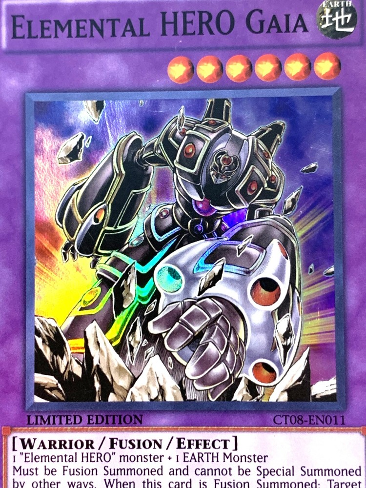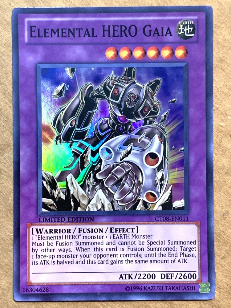 This auction is for (1x) one of the card listed in the title, in the condition listed in the title Elemental Hero Gaia CT08-EN011 Limited Edition Super Rare NEAR MINT If the condition is not specified the items will be in mint/near mint condition See our grading scale for details. FOR TRADING CARDS: CONDITION INFORMATION v Near Mint (NM) – Card will be Mint or very close to it. v Lightly Played (LP) – Card will have edge wear and/or small dents, but no major creases. v Moderately Played/Played (MP/P) – Card will have visible creases, dents and/or edge wear. v Heavily Played (HP) – Card will noticeable damage such as large creases and/or heavy edge wear. v Damaged (Da) - Card will be in very played condition, heavy edgewear, large creases, entire card may be played. SHIPPING INFORMATION Ø Your items will be shipped out within 24 hours of purchase on BUSINESS DAYS ONLY . This excludes Saturdays, Sundays, and US Holidays. Please allow 2-9 business days for USPS to deliver your items Ø Please add all items to your cart prior to checkout to ensure your items are mailed together. Ø VERY IMPORTANT - PLEASE READ!!! Check your shipping address prior to check out to be sure that we are sending it to the correct address!!! Please be sure to include apartment or unit #’s when applicable. · A PLAYMAT will be shipped in a cardboard tube and tracking information will be included. Multiple playmats will be shipped in a large bubble mailer. · SLEEVES will be shipped in a bubble mailer and tracking information will be included. · CARDS will be placed into a top loader and a sleeve during shipping for protection. Purchases over $15 will have tracking information, free of charge. · FULL DECKS will be sleeved, placed in a deck box, and shipped in a bubble mailer. Tracking will be included. WE SHIP INTERNATIONALLY!!! International Buyers - Please Note: Import duties, taxes, and charges are not included in the item price or shipping cost. These charges are the buyer's responsibility. Please check with your country's customs office to determine what these additional costs will be prior to bidding or buying. · Excludes South America – NO EXCEPTIONS · We will not claim less than the value of what you purchase, so please do not ask. · We ship via the Global Shipping program. Shipping charges are created by eBay and received by their third party shipping department, therefore we do not have any control over the prices. o Includes tracking information (even outside the U.S.). o Insurance for package is also included. FEEL SAFE WHEN SHOPPING WITH US THANK YOU FOR SHOPPING WITH US, PLEASE CHECK OUT OUR OTHER ITEMS FOR MORE GREAT DEALS!