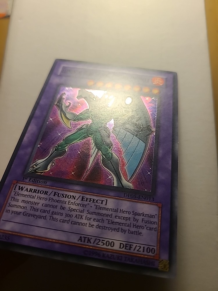 This rare Yu-Gi-Oh! TCG card features the Elemental Hero Phoenix Enforcer DP05-EN013 in its first edition. The card is in English and has a super rare rarity. It was manufactured by Konami in the United States in 1996. The card's attributes include darkness, game creature/monster type, and it is part of the 1996 set.