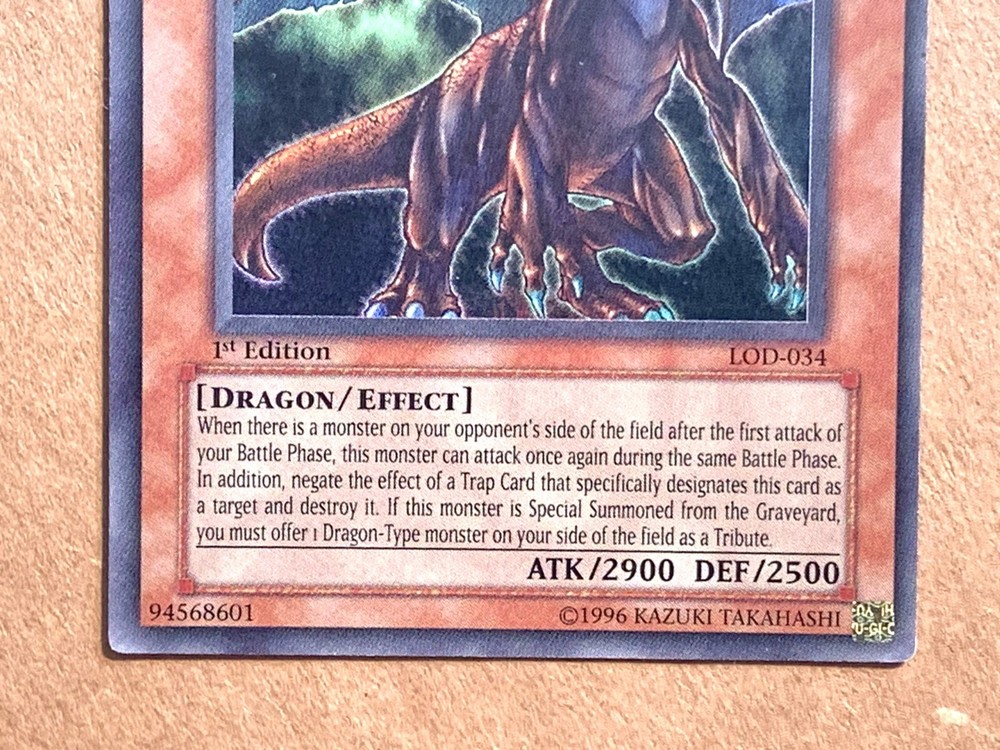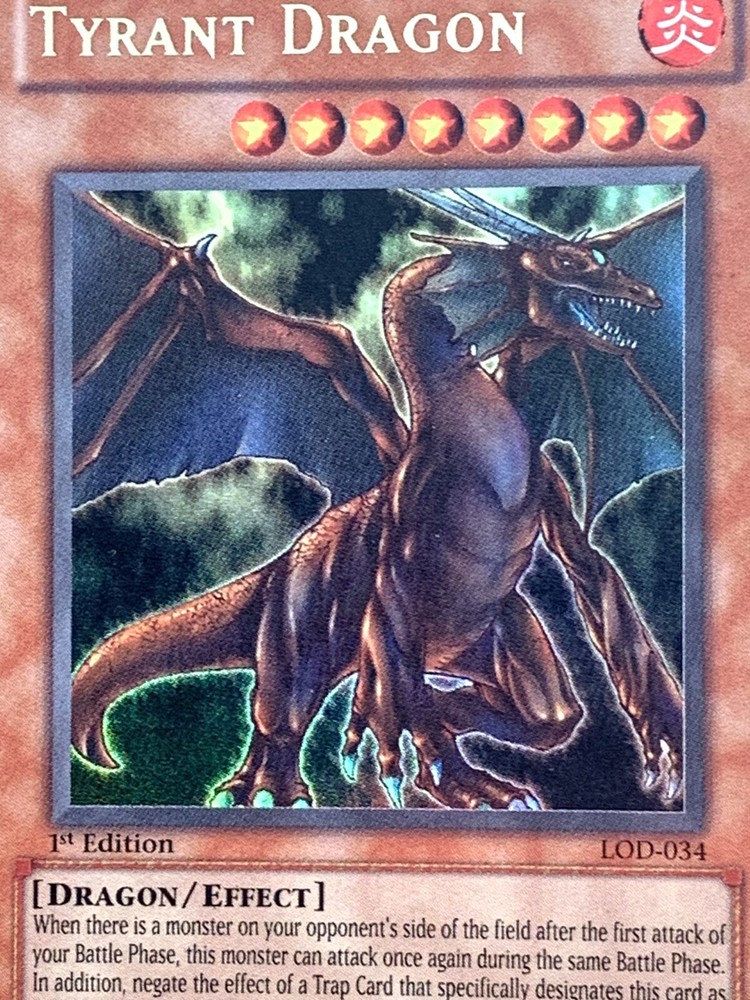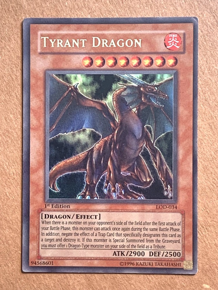 This auction is for (1x) one of the card listed in the title, in the condition listed in the title Tyrant Dragon LOD-034 1st Edition Ultra Rare Played Old School Vintage North America FOR TRADING CARDS: CONDITION INFORMATION v Near Mint (NM) – Card will be Mint or very close to it. v Lightly Played (LP) – Card will have edge wear and/or small dents, but no major creases. v Moderately Played/Played (MP/P) – Card will have visible creases, dents and/or edge wear. v Heavily Played (HP) – Card will noticeable damage such as large creases and/or heavy edge wear. v Damaged (Da) - Card will be in very played condition, heavy edgewear, large creases, entire card may be played. SHIPPING INFORMATION Ø Your items will be shipped out within 24 hours of purchase on BUSINESS DAYS ONLY . This excludes Saturdays, Sundays, and US Holidays. Please allow 2-9 business days for USPS to deliver your items Ø Please add all items to your cart prior to checkout to ensure your items are mailed together. Ø VERY IMPORTANT - PLEASE READ!!! Check your shipping address prior to check out to be sure that we are sending it to the correct address!!! Please be sure to include apartment or unit #’s when applicable. · A PLAYMAT will be shipped in a cardboard tube and tracking information will be included. Multiple playmats will be shipped in a large bubble mailer. · SLEEVES will be shipped in a bubble mailer and tracking information will be included. · CARDS will be placed into a top loader and a sleeve during shipping for protection. Purchases over $15 will have tracking information, free of charge. · FULL DECKS will be sleeved, placed in a deck box, and shipped in a bubble mailer. Tracking will be included. WE SHIP INTERNATIONALLY!!! International Buyers - Please Note: Import duties, taxes, and charges are not included in the item price or shipping cost. These charges are the buyer's responsibility. Please check with your country's customs office to determine what these additional costs will be prior to bidding or buying. · Excludes South America – NO EXCEPTIONS · We will not claim less than the value of what you purchase, so please do not ask. · We ship via the Global Shipping program. Shipping charges are created by eBay and received by their third party shipping department, therefore we do not have any control over the prices. o Includes tracking information (even outside the U.S.). o Insurance for package is also included. FEEL SAFE WHEN SHOPPING WITH US THANK YOU FOR SHOPPING WITH US, PLEASE CHECK OUT OUR OTHER ITEMS FOR MORE GREAT DEALS!